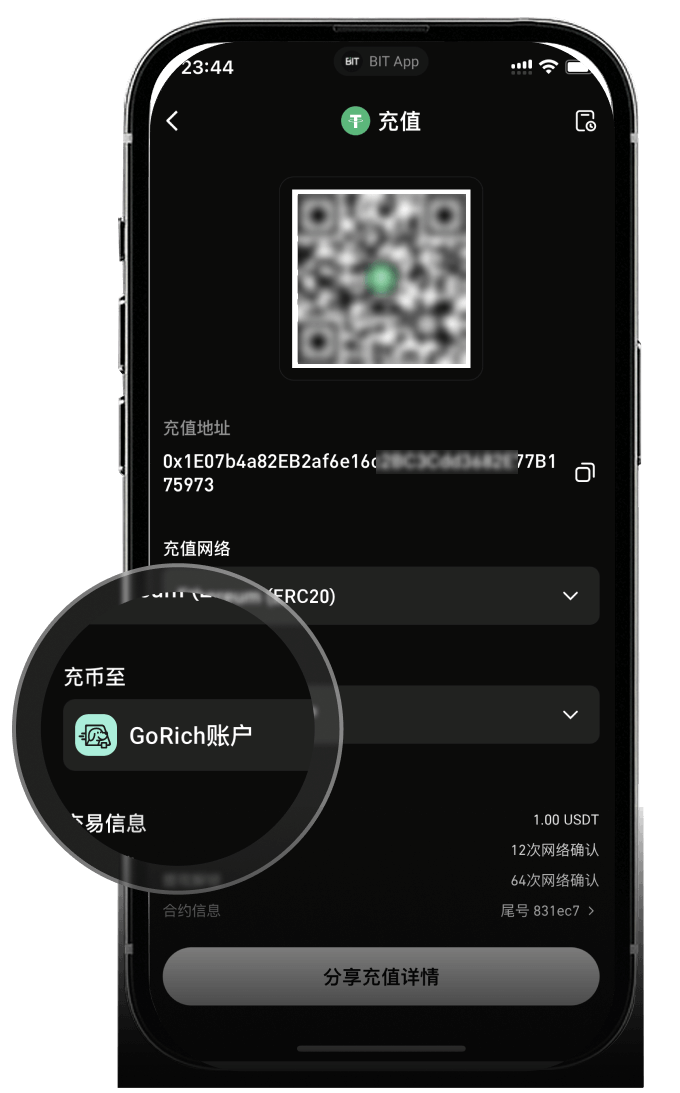 充值:直接向 GoRich 账户充币(支持 BNB、ETH、SOL、USD、USDT)。